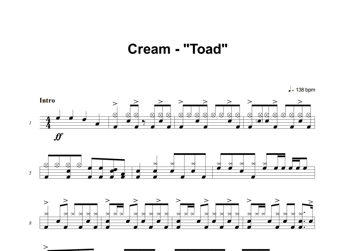 《Toad》是Cream演唱的一首歌曲,这份架子鼓谱共有十张高清图谱,图谱由 @积极处世 编配上传,图谱使用五线谱编配,使用这份Toad架子鼓谱,你将能够轻松地敲打出这首Cream的Toad,快来尝试吧。