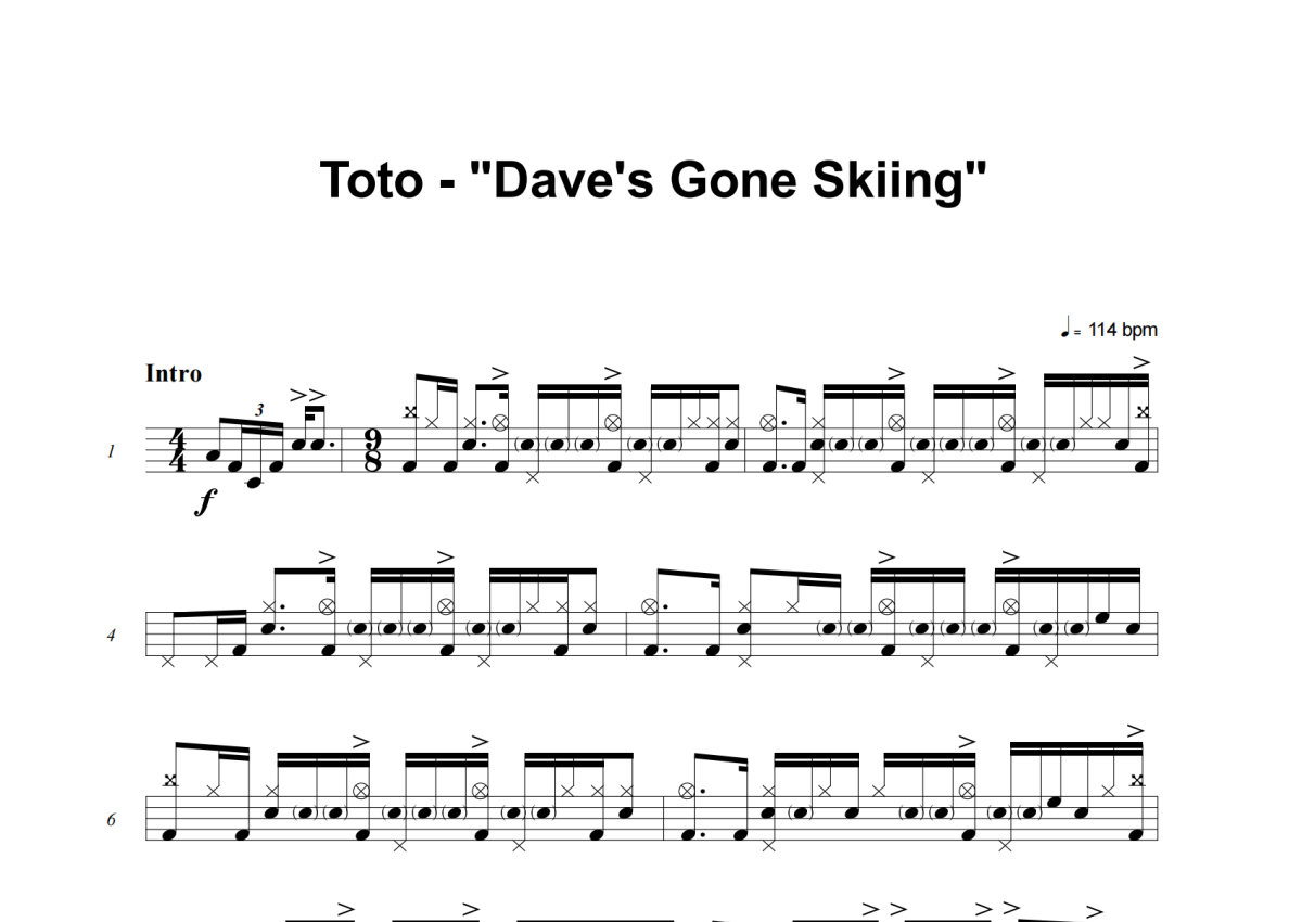 《Dave's Gone Skiing》是Toto演唱的一首歌曲,这份架子鼓谱共有八张高清图谱,图谱由 @积极处世 编配上传,图谱使用五线谱编配,使用这份Dave's Gone Skiing架子鼓谱,你将能够轻松地敲打出这首Toto的Dave's Gone Skiing,快来尝试吧。