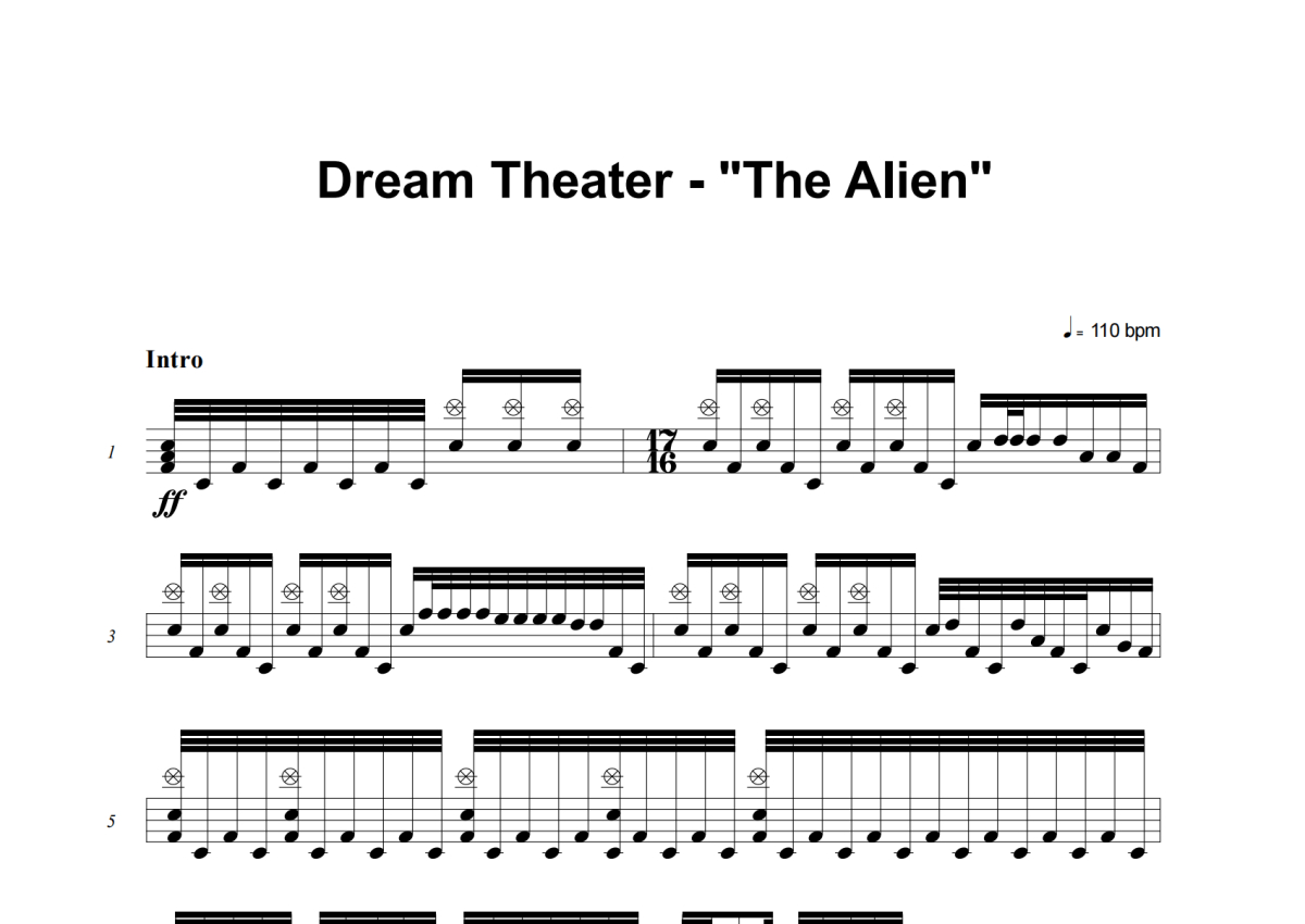 《The Alien》是Dream Theater演唱的一首歌曲,这份架子鼓谱共有十四张高清图谱,图谱由 @积极处世 编配上传,图谱使用五线谱编配,使用这份The Alien架子鼓谱,你将能够轻松地敲打出这首Dream Theater的The Alien,快来尝试吧。