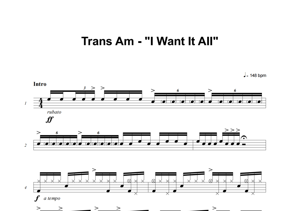 《I Want It All》是Trans Am演唱的一首歌曲,这份架子鼓谱共有九张高清图谱,图谱由 @积极处世 编配上传,图谱使用五线谱编配,使用这份I Want It All架子鼓谱,你将能够轻松地敲打出这首Trans Am的I Want It All,快来尝试吧。