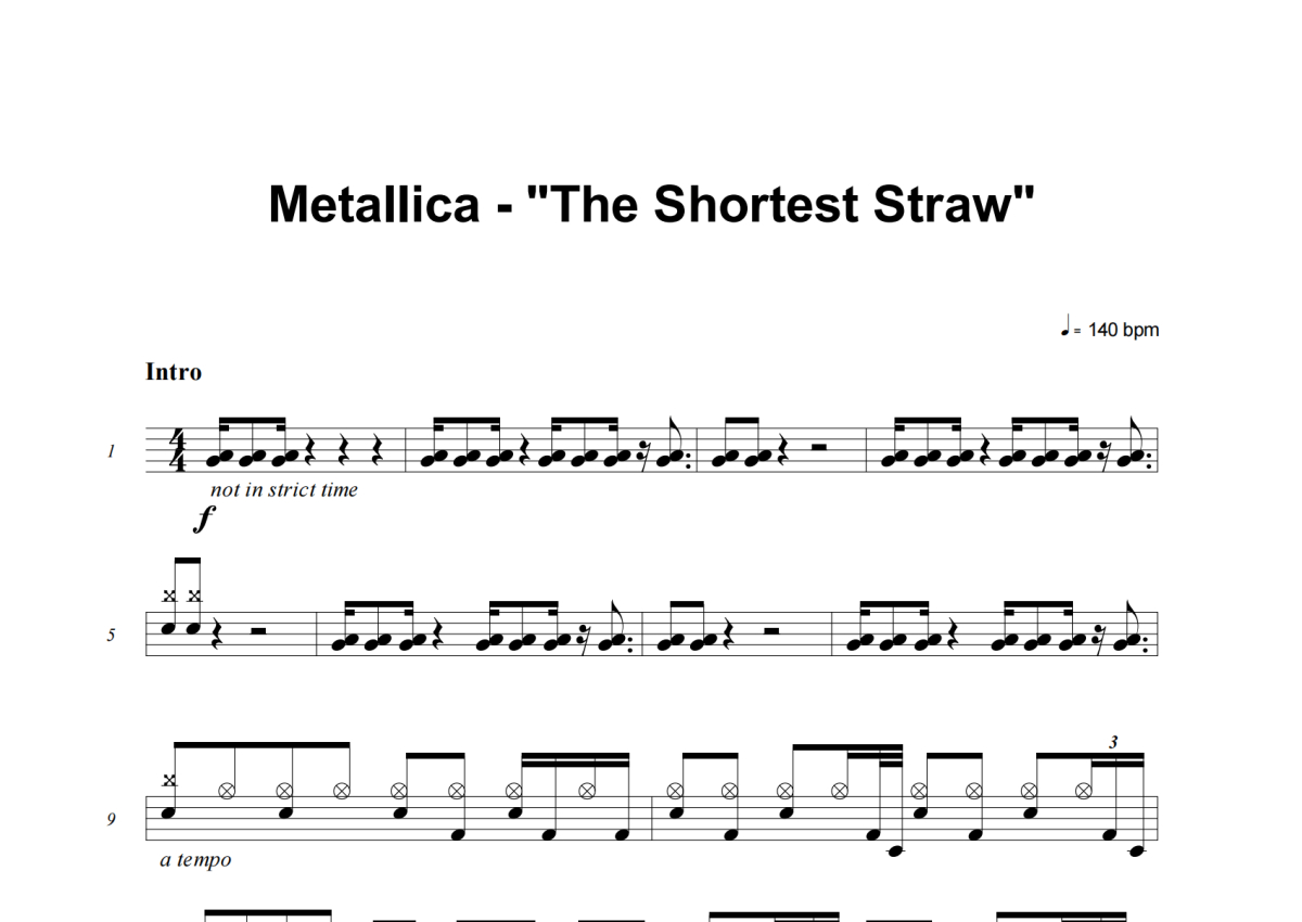 《The Shortest Straw》是Metallica演唱的一首歌曲,这份架子鼓谱共有十二张高清图谱,图谱由 @积极处世 编配上传,图谱使用五线谱编配,使用这份The Shortest Straw架子鼓谱,你将能够轻松地敲打出这首Metallica的The Shortest Straw,快来尝试吧。