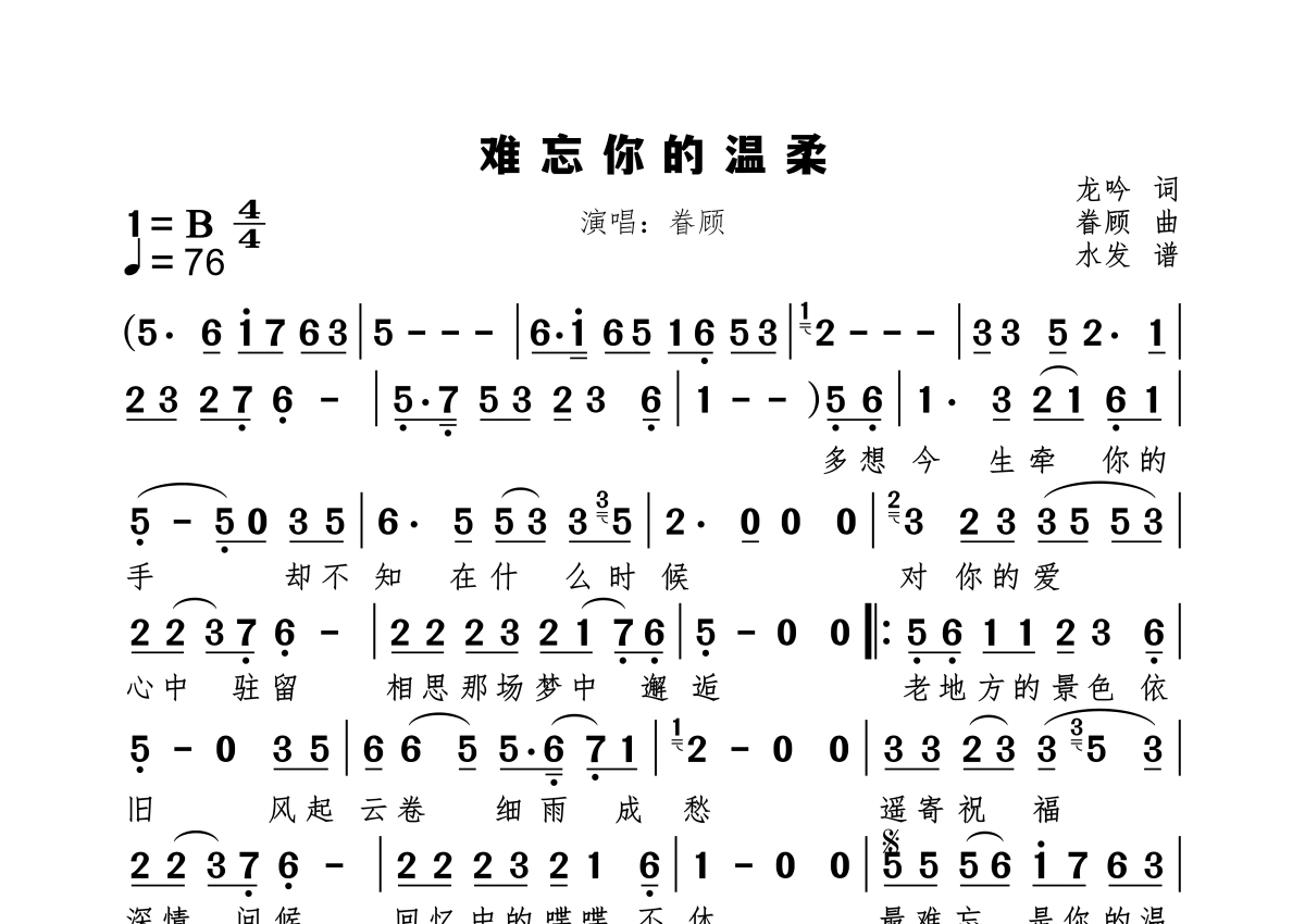 《难忘你的温柔》是眷顾演唱的一首歌曲,拍号为4/4拍,歌曲速度为每分钟76拍,这份简谱共有一张高清图谱,图谱由 @水当 编配上传原调B。