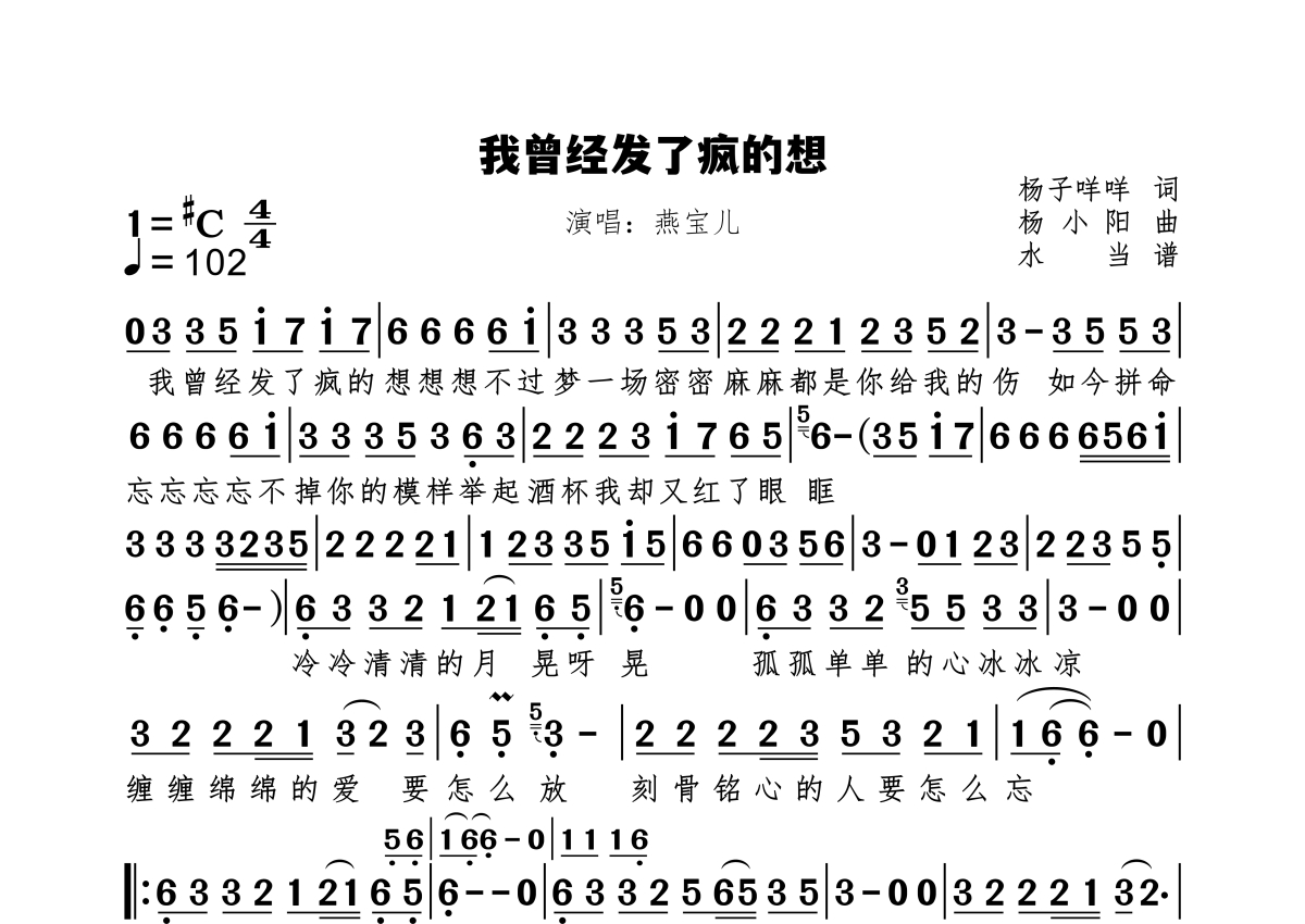 我曾经发了疯的想简谱 - 燕宝儿演唱