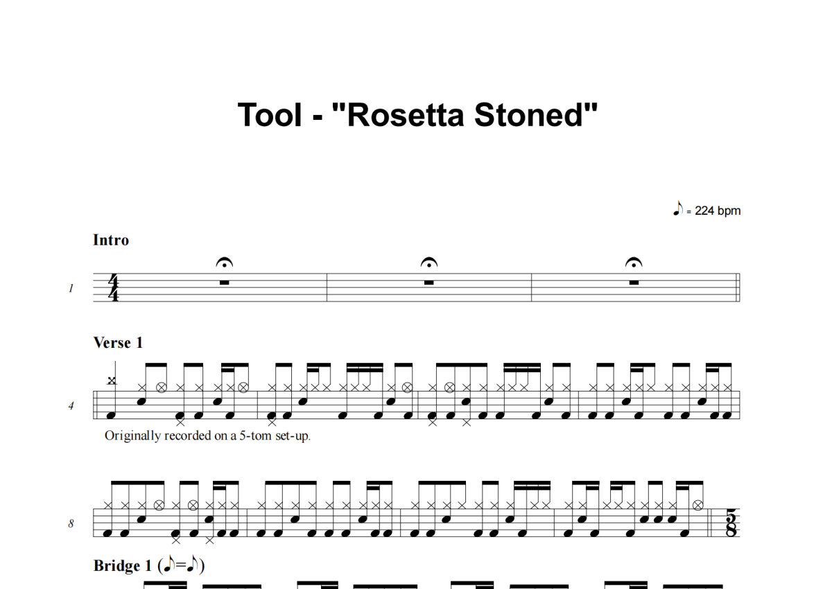 《Rosetta Stoned》是Tool演唱的一首歌曲,这份架子鼓谱共有十六张高清图谱,图谱由 @举个例子 编配上传,图谱使用五线谱编配,使用这份Rosetta Stoned架子鼓谱,你将能够轻松地敲打出这首Tool的Rosetta Stoned,快来尝试吧。