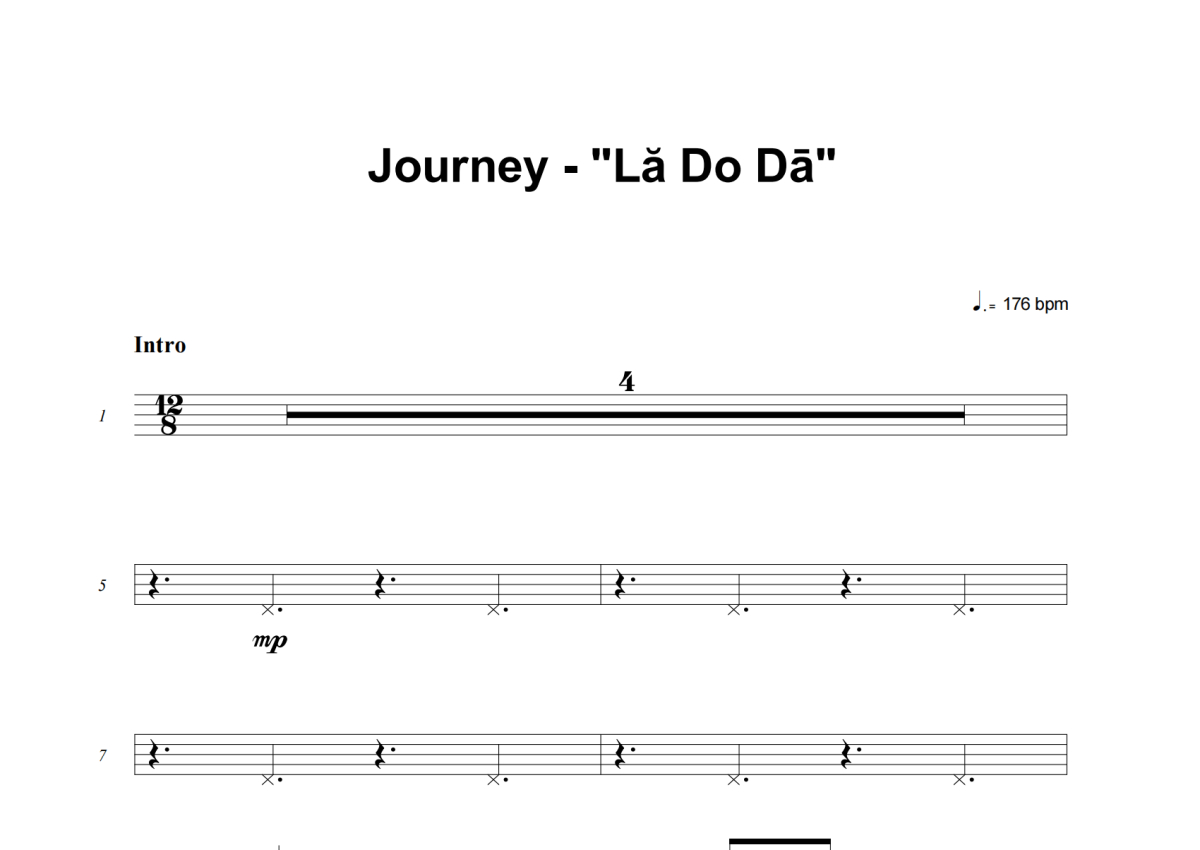《Lă Do Dā》是Journey演唱的一首歌曲,这份架子鼓谱共有十六张高清图谱,图谱由 @举个例子 编配上传,图谱使用五线谱编配,使用这份Lă Do Dā架子鼓谱,你将能够轻松地敲打出这首Journey的Lă Do Dā,快来尝试吧。
