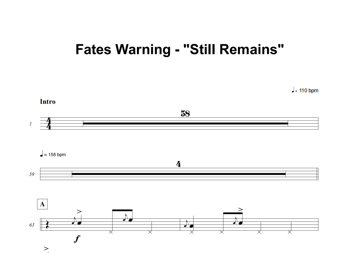《Still Remains》是Fates Warning演唱的一首歌曲,这份架子鼓谱共有十九张高清图谱,图谱由 @举个例子 编配上传,图谱使用五线谱编配,使用这份Still Remains架子鼓谱,你将能够轻松地敲打出这首Fates Warning的Still Remains,快来尝试吧。