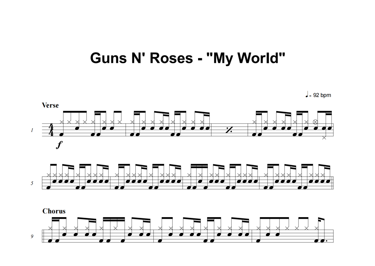 《My World》是Guns N' Roses演唱的一首歌曲,这份架子鼓谱共有一张高清图谱,图谱由 @举个例子 编配上传,图谱使用五线谱编配,使用这份My World架子鼓谱,你将能够轻松地敲打出这首Guns N' Roses的My World,快来尝试吧。