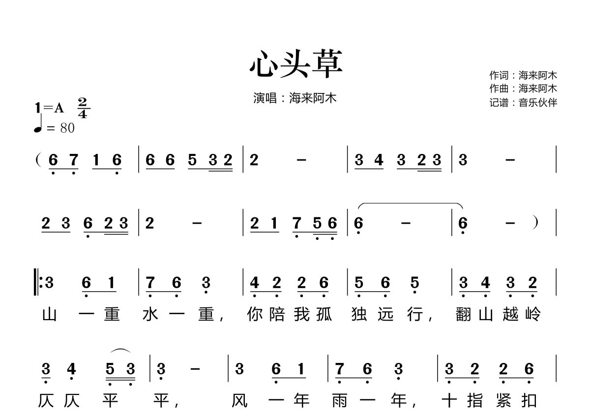 《心头草》是海来阿木演唱的一首歌曲,拍号为2/4拍,歌曲速度为每分钟80拍,这份简谱共有两张高清图谱,图谱由 @音乐伙伴 编配上传。