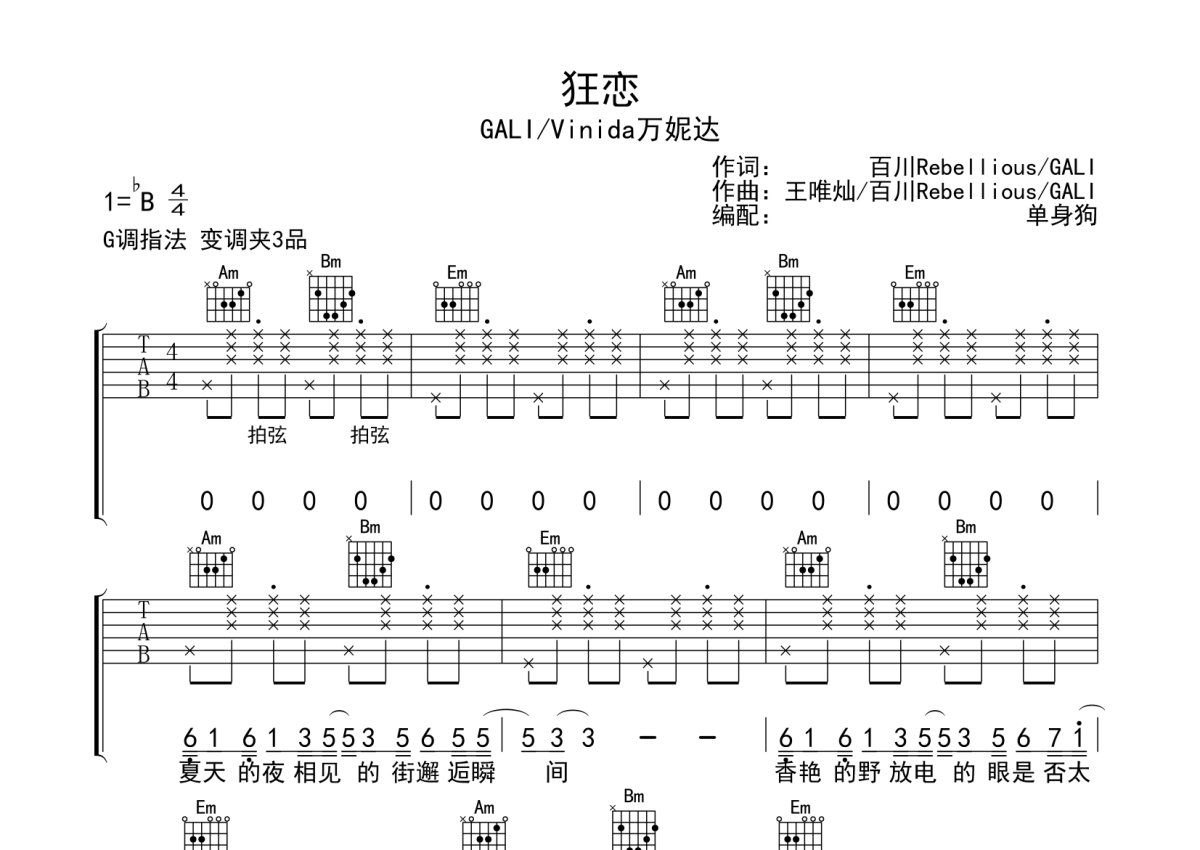 GALI/Vinida万妮达《狂恋》吉他谱 - G调弹唱六线谱