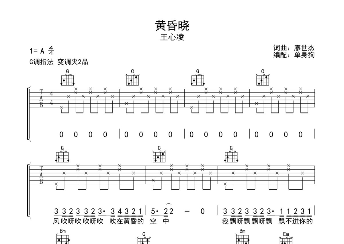 《黄昏晓》是王心凌演唱的一首歌曲,本吉他谱采用的是G调指法编配,这份吉他谱共有三张高清图谱,图谱由 @单身狗 编配上传,图谱使用六线谱编配,包含吉他和弦指法、简谱以及歌词部分,使用这份黄昏晓吉他谱,可以让你更加方便地掌握这首歌曲的弹唱技巧,快来尝试吧。王心凌《黄昏晓》吉他弹唱谱,采用G调指法编配,单身狗编配出品,共有3张高清图谱。