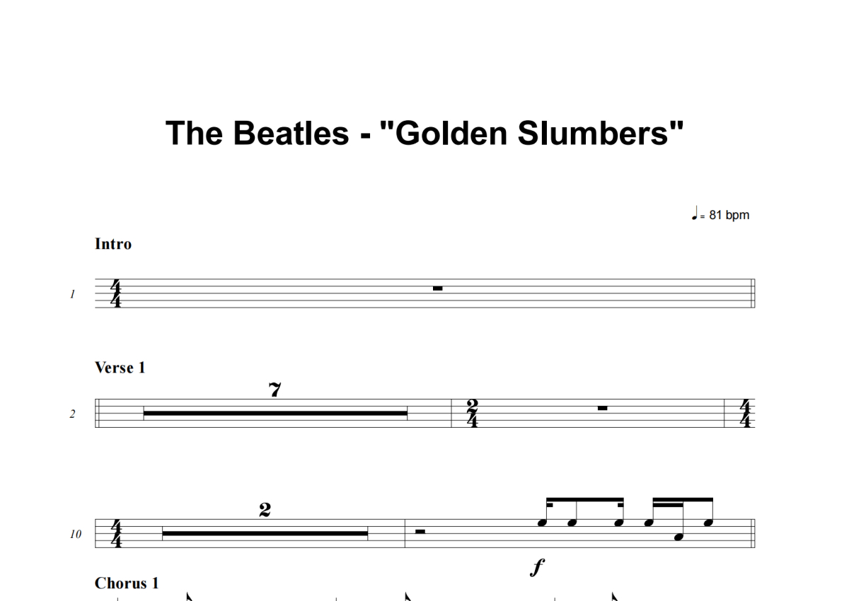 《Golden Slumbers》是The Beatles演唱的一首歌曲,这份架子鼓谱共有两张高清图谱,图谱由 @举个例子 编配上传,图谱使用五线谱编配,使用这份Golden Slumbers架子鼓谱,你将能够轻松地敲打出这首The Beatles的Golden Slumbers,快来尝试吧。