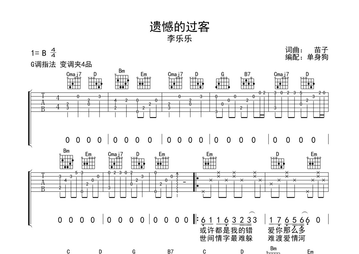 李乐乐《遗憾的过客》吉他谱 - G调弹唱六线谱