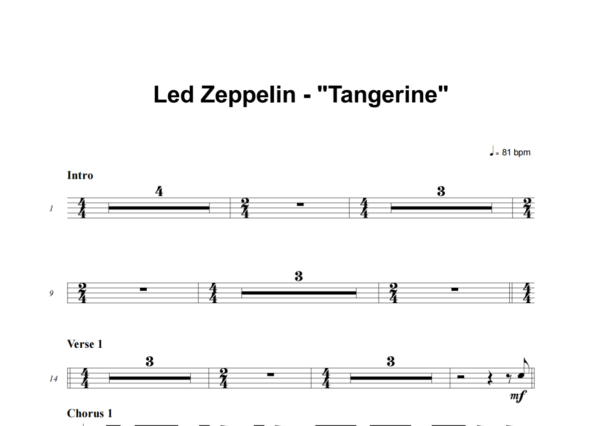 《Tangerine》是Led Zeppelin演唱的一首歌曲,这份架子鼓谱共有两张高清图谱,图谱由 @举个例子 编配上传,图谱使用五线谱编配,使用这份Tangerine架子鼓谱,你将能够轻松地敲打出这首Led Zeppelin的Tangerine,快来尝试吧。