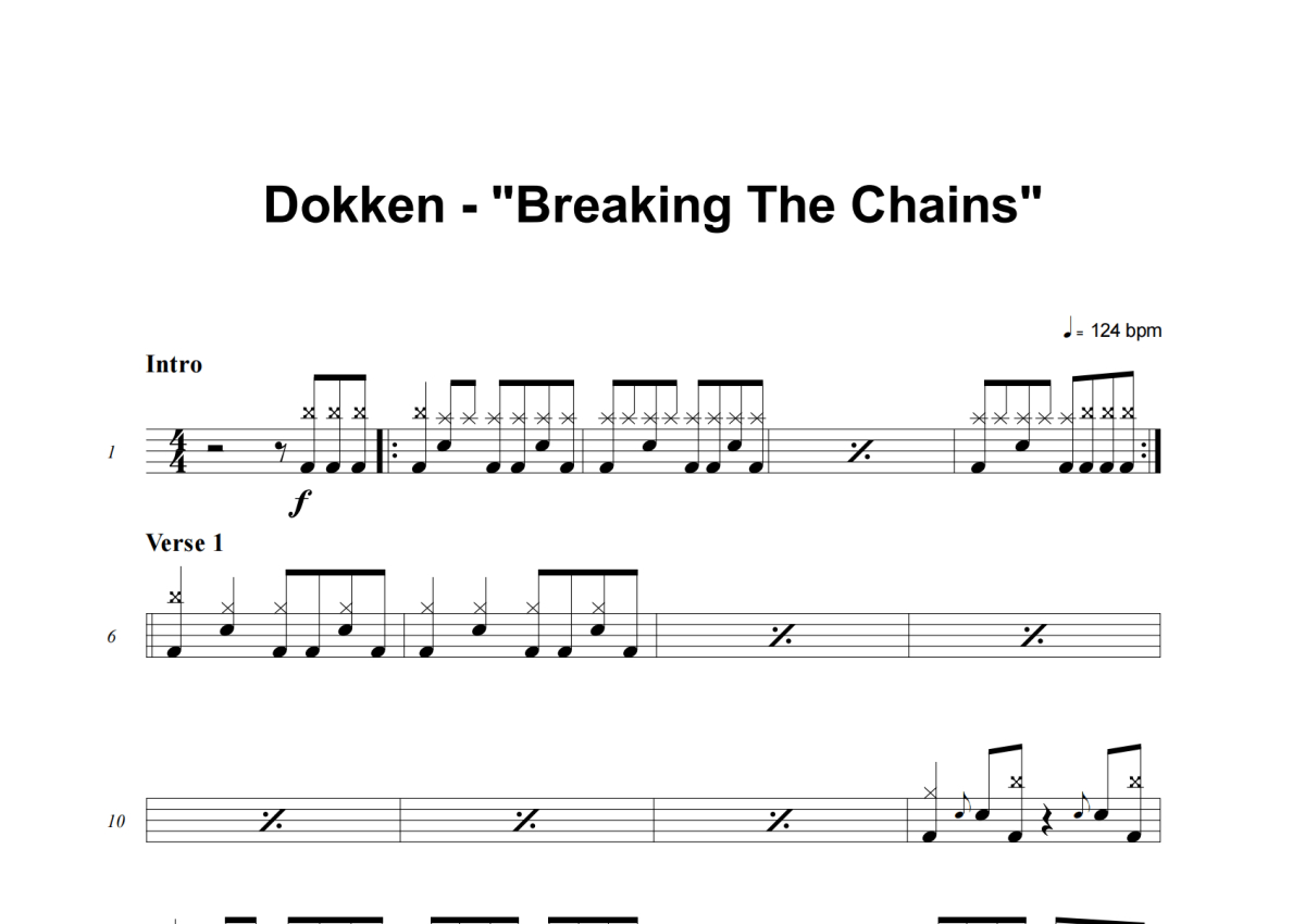《Breaking The Chains》是Dokken演唱的一首歌曲,这份架子鼓谱共有四张高清图谱,图谱由 @举个例子 编配上传,图谱使用五线谱编配,使用这份Breaking The Chains架子鼓谱,你将能够轻松地敲打出这首Dokken的Breaking The Chains,快来尝试吧。