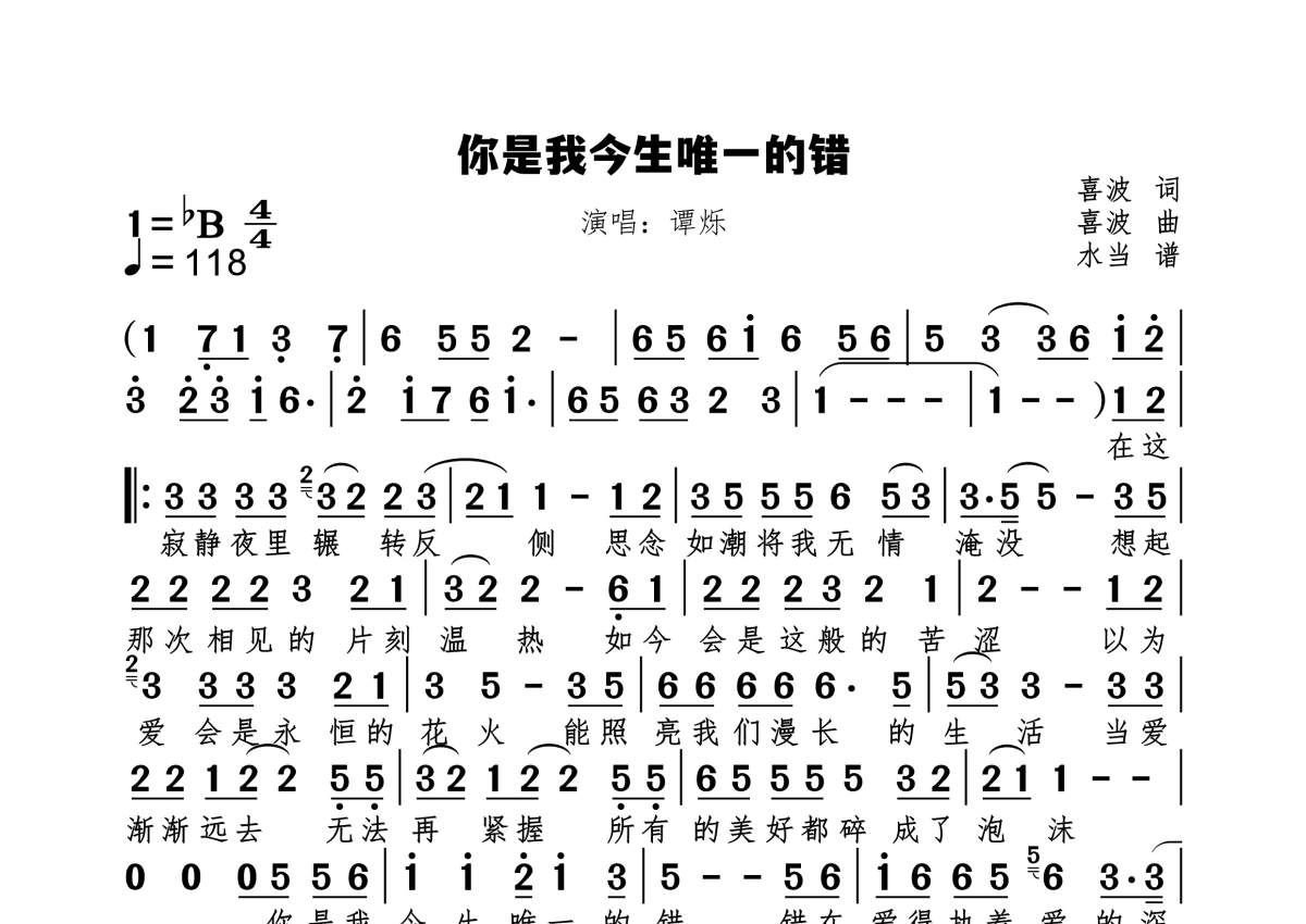 《你是我今生唯一的错》是谭烁演唱的一首歌曲,拍号为4/4拍,歌曲速度为每分钟118拍,这份简谱共有一张高清图谱,图谱由 @水当 编配上传原调bB。