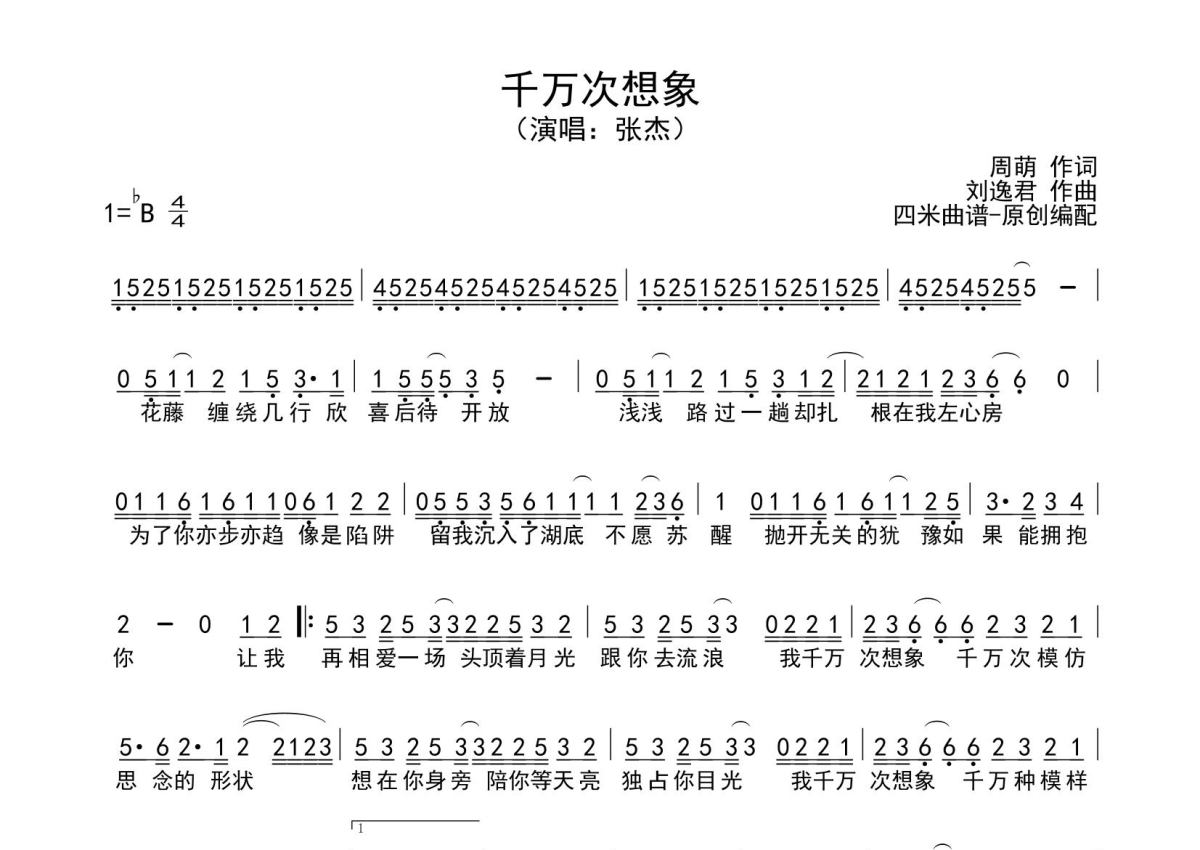 《千万次想象》是张杰演唱的一首歌曲,拍号为4/4拍,这份简谱共有一张高清图谱,图谱由 @SRV7758521 编配上传。