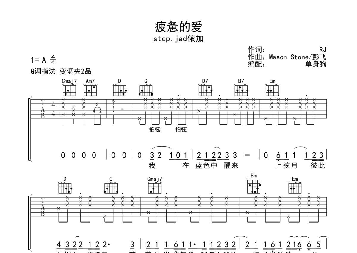 step.jad依加《疲惫的爱》吉他谱 - G调弹唱六线谱