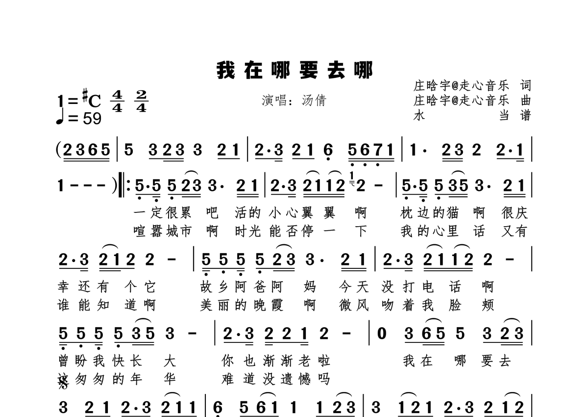 《我在哪要去哪》是汤倩演唱的一首歌曲,拍号为4/4拍,歌曲速度为每分钟59拍,这份简谱共有一张高清图谱,图谱由 @水当 编配上传原调#C。