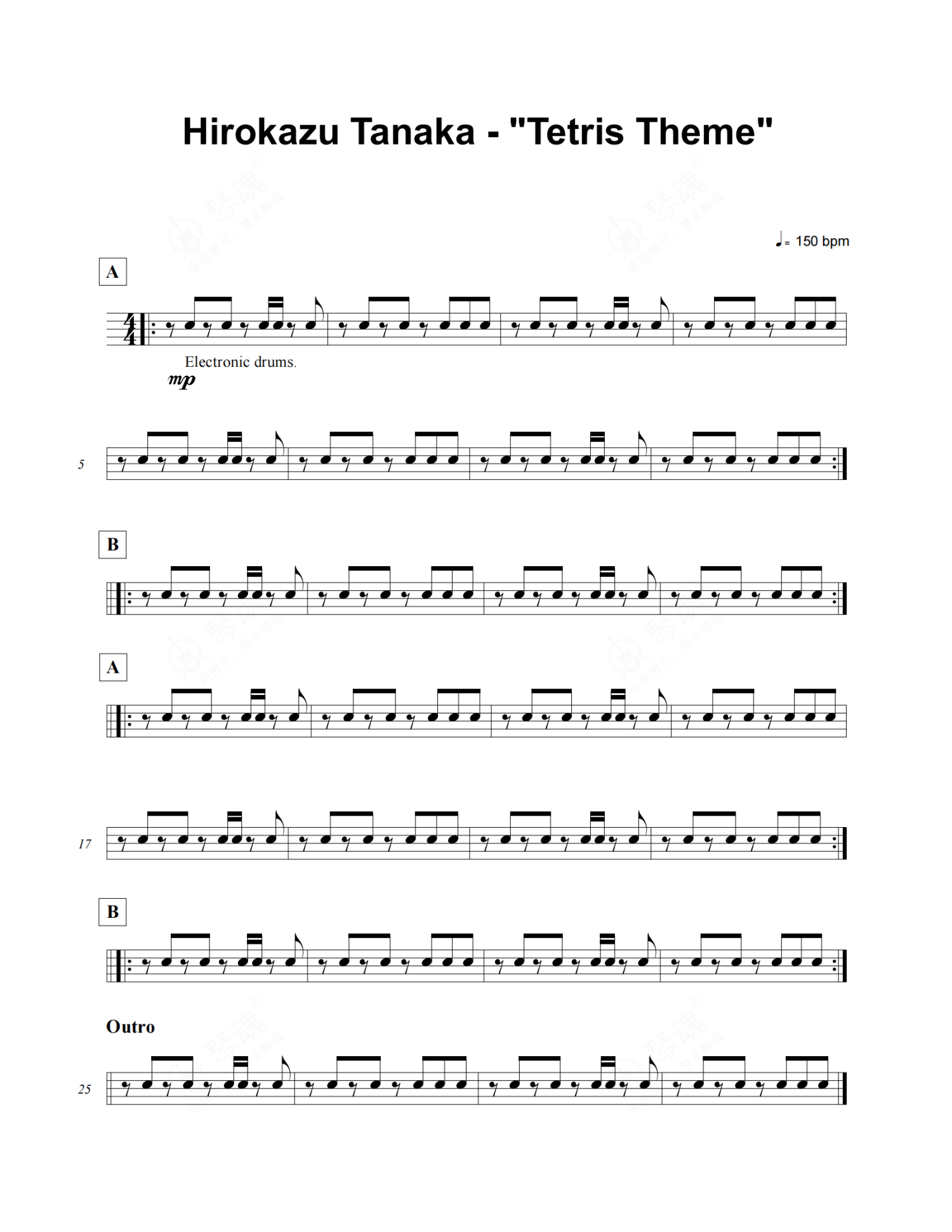 《Tetris Theme》是Hirokazu Tanaka演唱的一首歌曲,这份架子鼓谱共有一张高清图谱,图谱由 @举个例子 编配上传,图谱使用五线谱编配,使用这份Tetris Theme架子鼓谱,你将能够轻松地敲打出这首Hirokazu Tanaka的Tetris Theme,快来尝试吧。