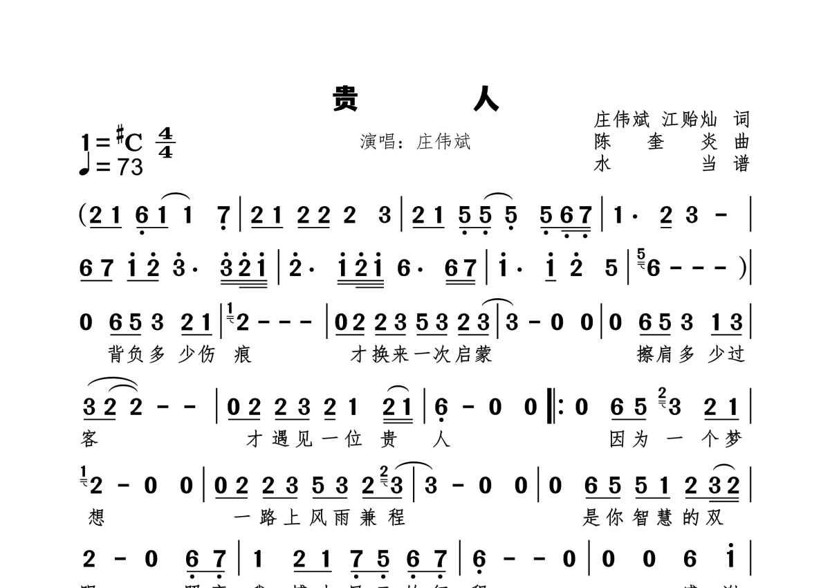 《贵人》是庄伟斌演唱的一首歌曲,拍号为4/4拍,歌曲速度为每分钟73拍,这份简谱共有一张高清图谱,图谱由 @水当 编配上传原调#C。