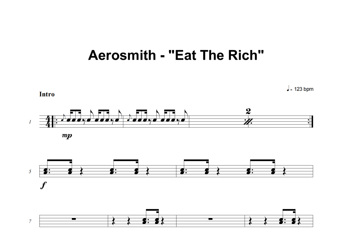 《Eat The Rich》是Aerosmith演唱的一首歌曲,这份架子鼓谱共有四张高清图谱,图谱由 @举个例子 编配上传,图谱使用五线谱编配,使用这份Eat The Rich架子鼓谱,你将能够轻松地敲打出这首Aerosmith的Eat The Rich,快来尝试吧。