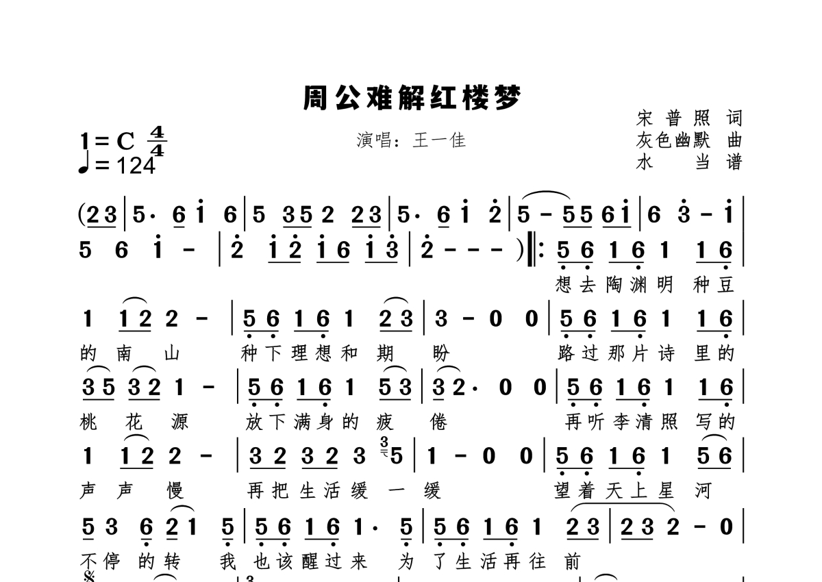 《周公难解红楼梦》是王一佳演唱的一首歌曲,拍号为4/4拍,歌曲速度为每分钟124拍,这份简谱共有一张高清图谱,图谱由 @水当 编配上传原调C。