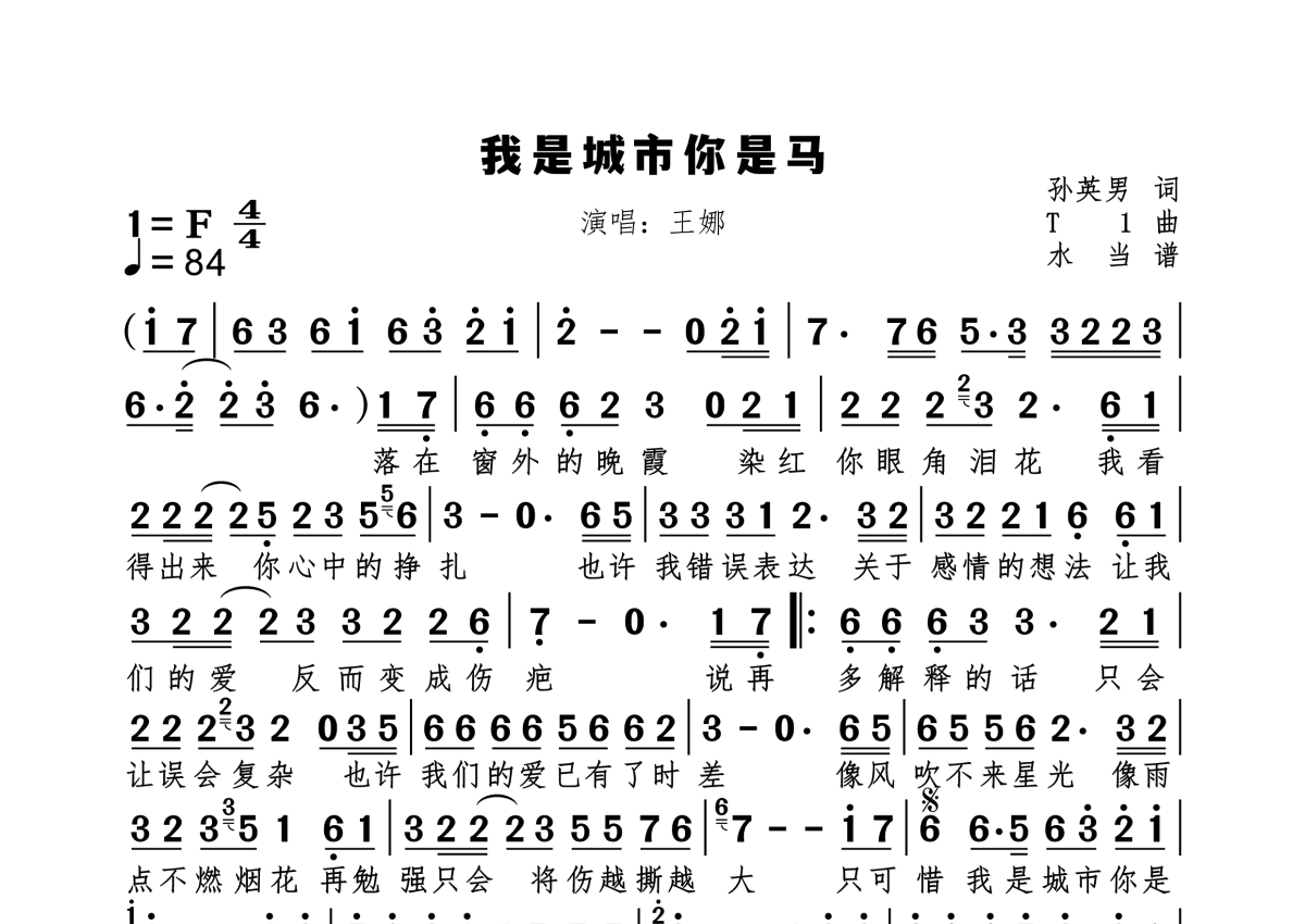 《我是城市你是马》是王娜演唱的一首歌曲,拍号为4/4拍,歌曲速度为每分钟84拍,这份简谱共有一张高清图谱,图谱由 @水当 编配上传原调F。