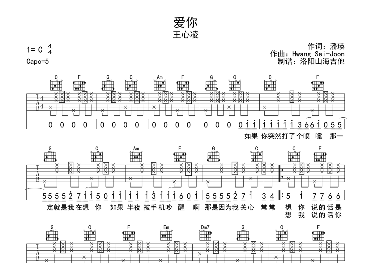 王心凌《爱你》吉他谱 - C调弹唱六线谱
