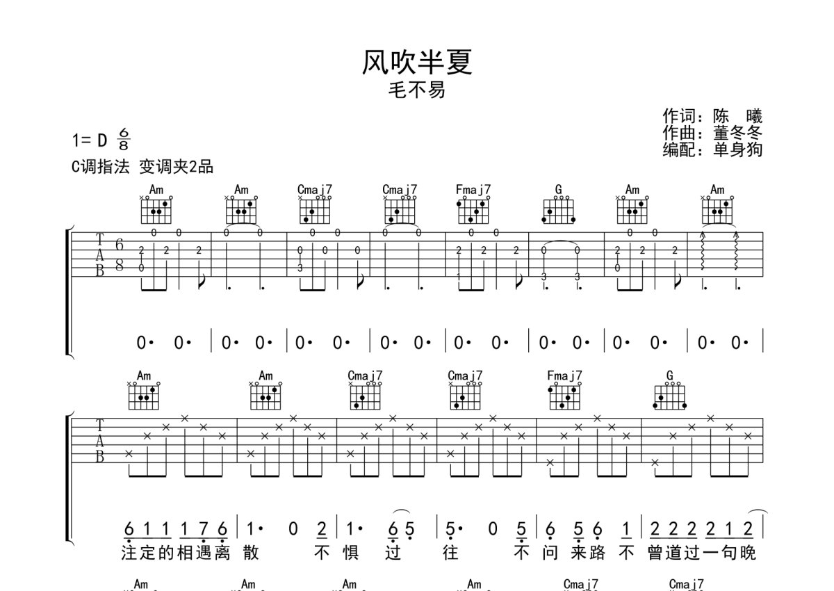 毛不易《风吹半夏》吉他谱 - C调弹唱六线谱