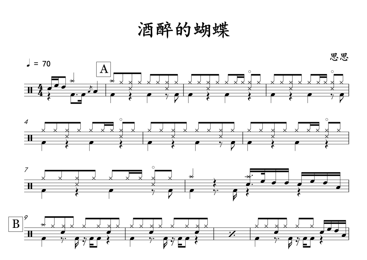 《酒醉的蝴蝶》是思思演唱的一首歌曲,拍号为4/4拍,歌曲速度为每分钟70拍,这份架子鼓谱共有两张高清图谱,图谱由 @音符喷血者 编配上传,图谱使用五线谱编配,使用这份酒醉的蝴蝶架子鼓谱,你将能够轻松地敲打出这首思思的酒醉的蝴蝶,快来尝试吧。