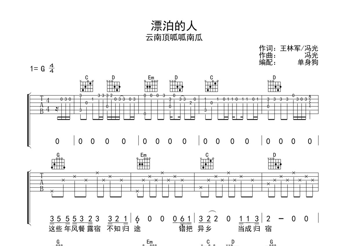 云南顶呱呱南瓜《漂泊的人》吉他谱 - G调弹唱六线谱