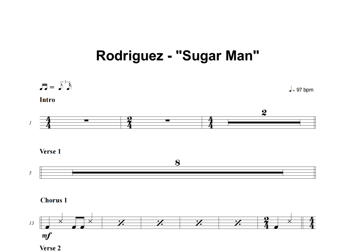 《Sugar Man》是Rodriguez演唱的一首歌曲,这份架子鼓谱共有两张高清图谱,图谱由 @举个例子 编配上传,图谱使用五线谱编配,使用这份Sugar Man架子鼓谱,你将能够轻松地敲打出这首Rodriguez的Sugar Man,快来尝试吧。