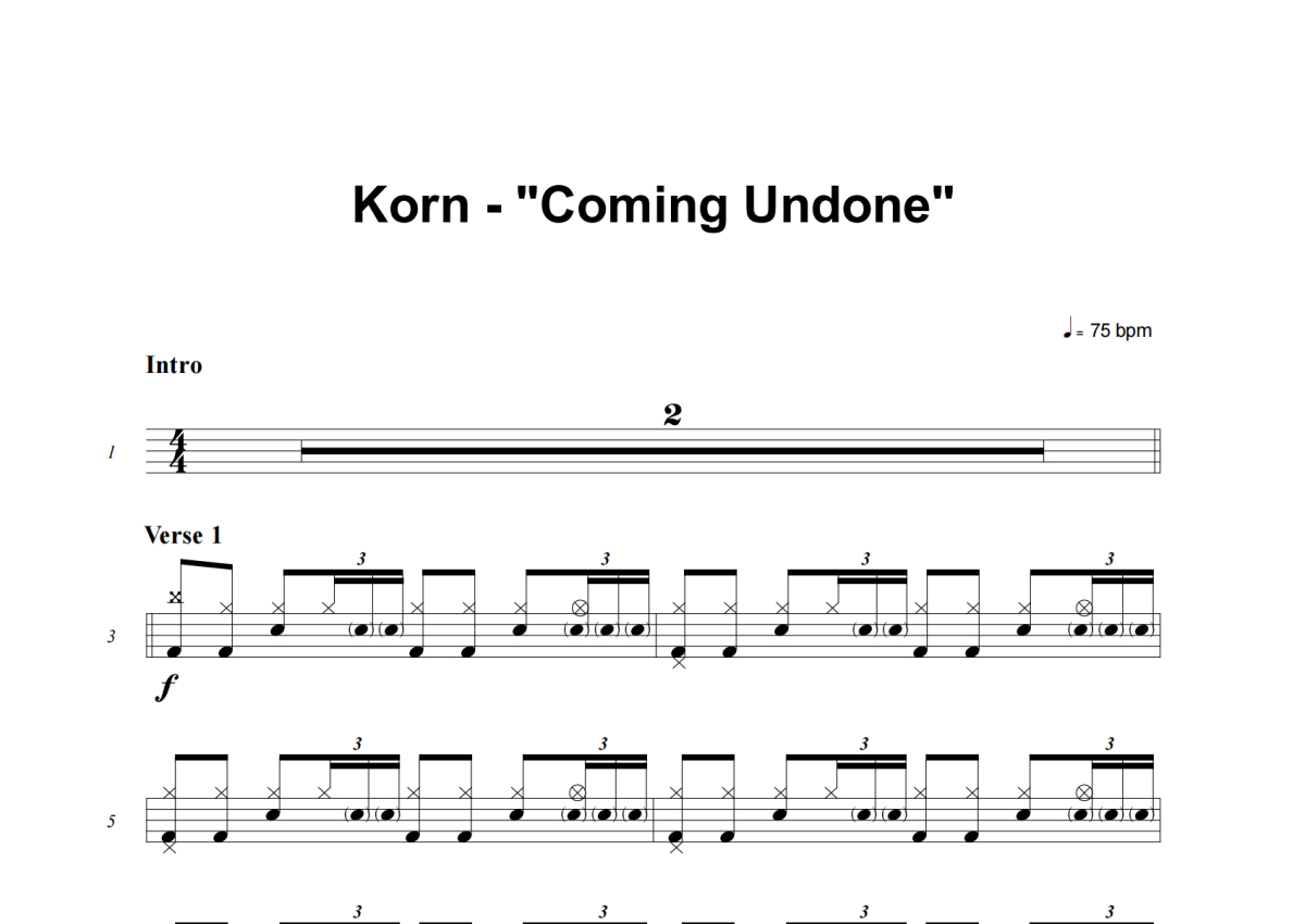 《Coming Undone》是Korn演唱的一首歌曲,这份架子鼓谱共有四张高清图谱,图谱由 @举个例子 编配上传,图谱使用五线谱编配,使用这份Coming Undone架子鼓谱,你将能够轻松地敲打出这首Korn的Coming Undone,快来尝试吧。