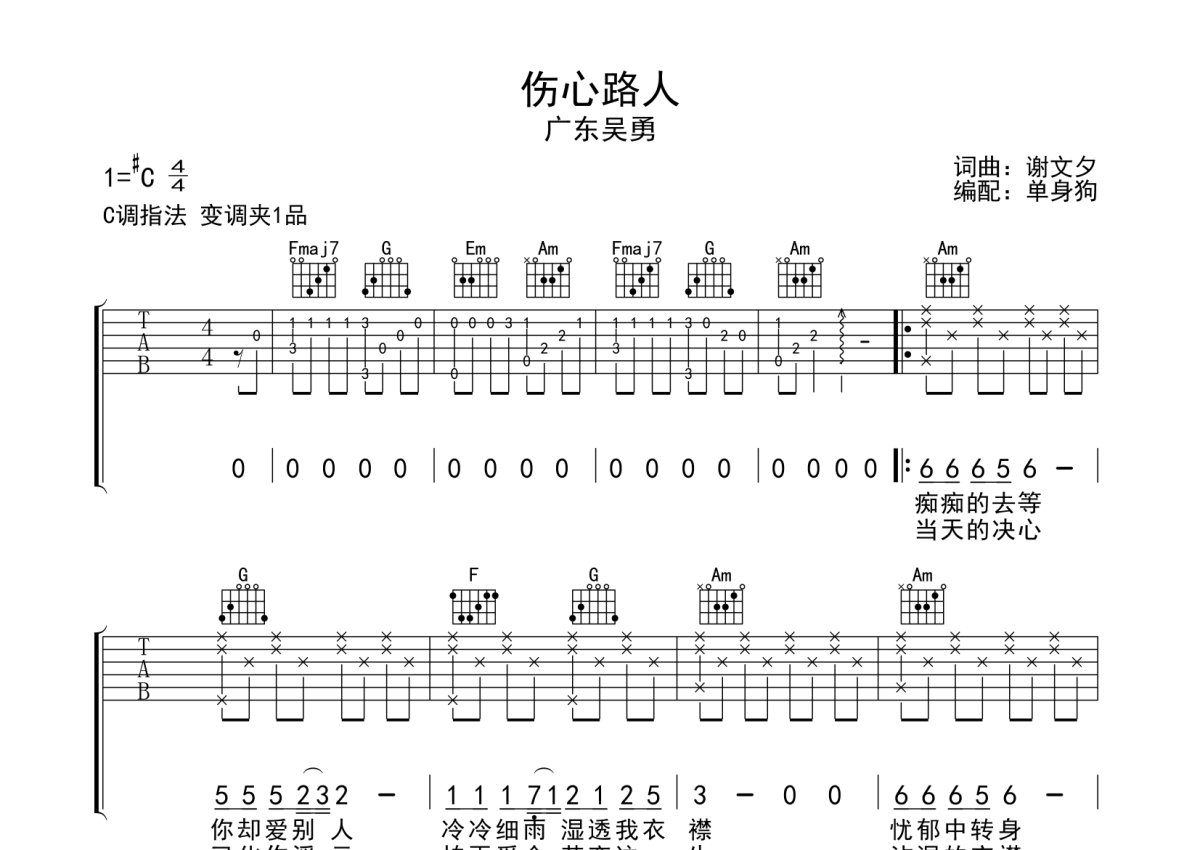 广东吴勇《伤心路人》吉他谱 - C调弹唱六线谱