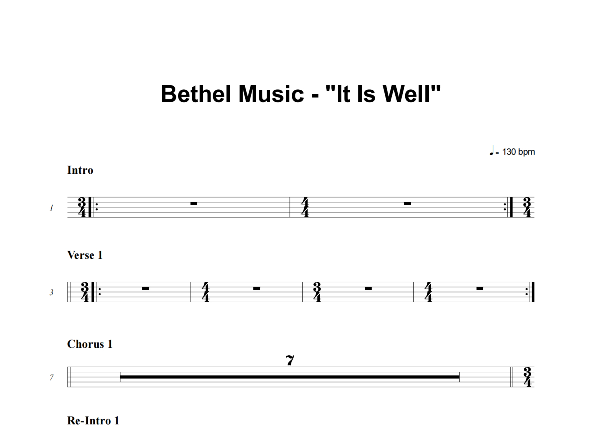 《It Is Well》是Bethel Music演唱的一首歌曲,这份架子鼓谱共有三张高清图谱,图谱由 @举个例子 编配上传,图谱使用五线谱编配,使用这份It Is Well架子鼓谱,你将能够轻松地敲打出这首Bethel Music的It Is Well,快来尝试吧。