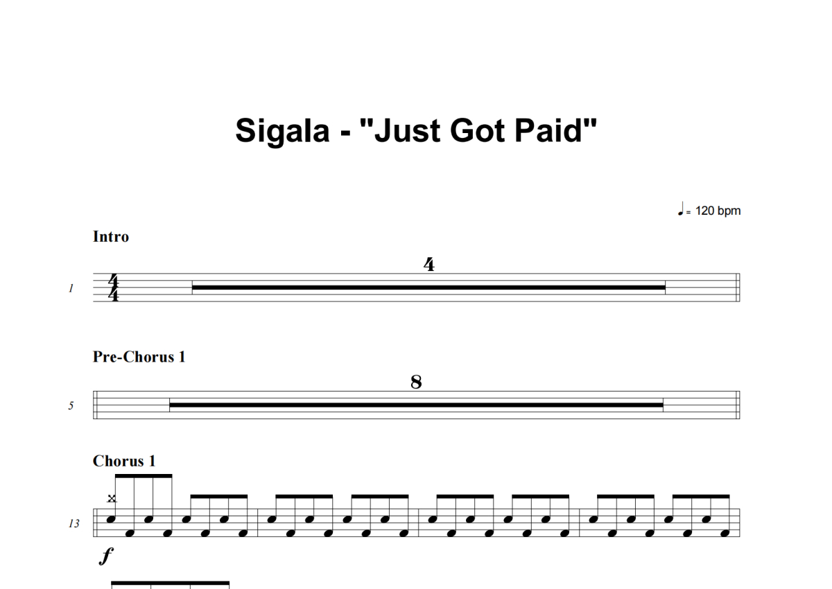《Just Got Paid》是Sigala演唱的一首歌曲,这份架子鼓谱共有四张高清图谱,图谱由 @举个例子 编配上传,图谱使用五线谱编配,使用这份Just Got Paid架子鼓谱,你将能够轻松地敲打出这首Sigala的Just Got Paid,快来尝试吧。