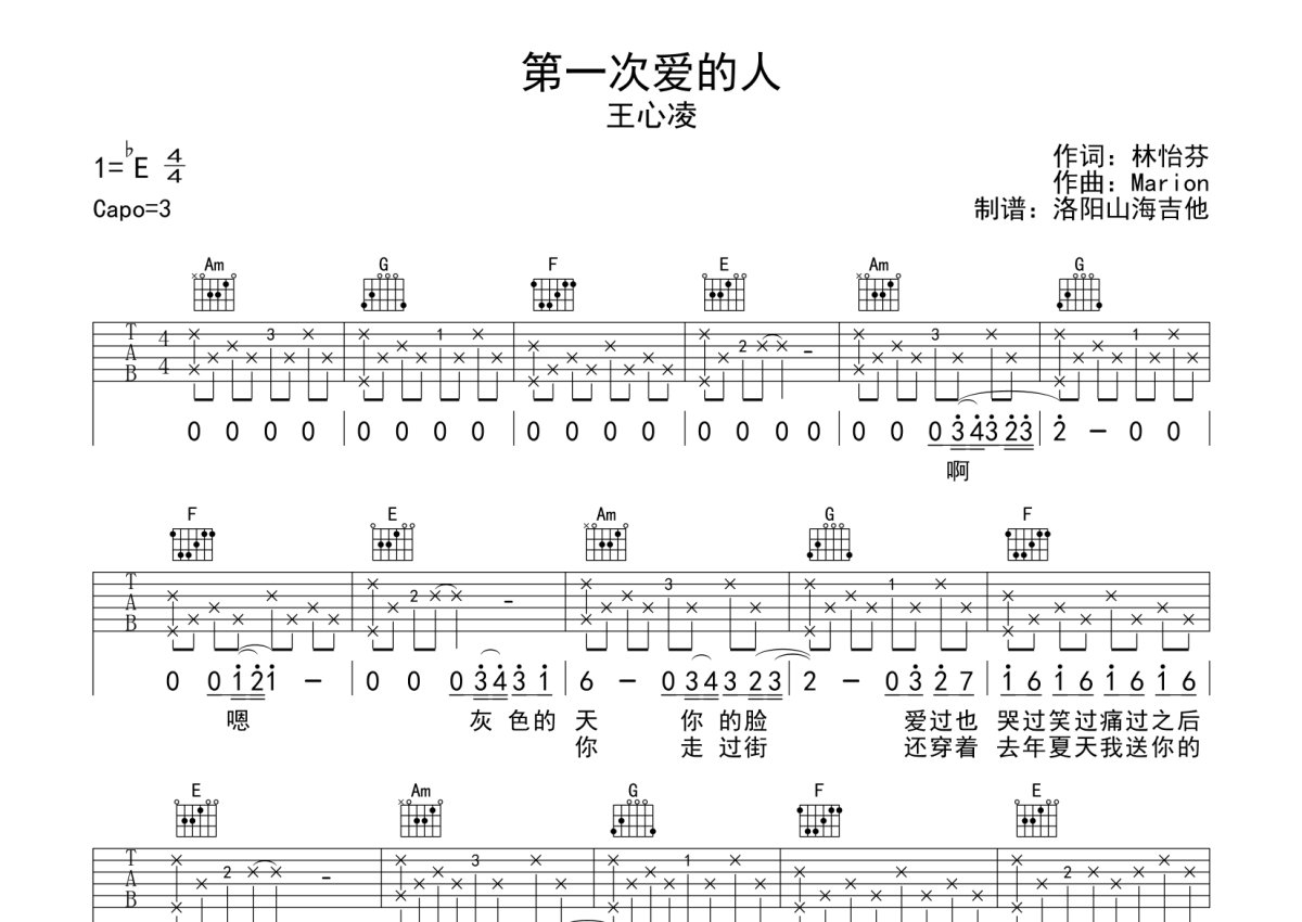 王心凌《第一次爱的人》吉他谱 - C调弹唱六线谱