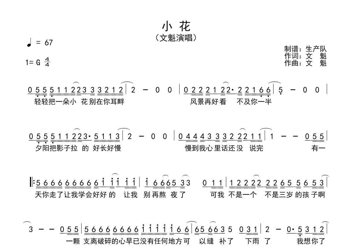 《小花》是文魁演唱的一首歌曲,原版简谱,拍号为4/4拍,歌曲速度为每分钟67拍,这份简谱共有一张高清图谱,图谱由 @生产队 编配上传文魁演唱的歌曲《小花》原版简谱,含间奏solo编配,精编完美版,值得推荐!。