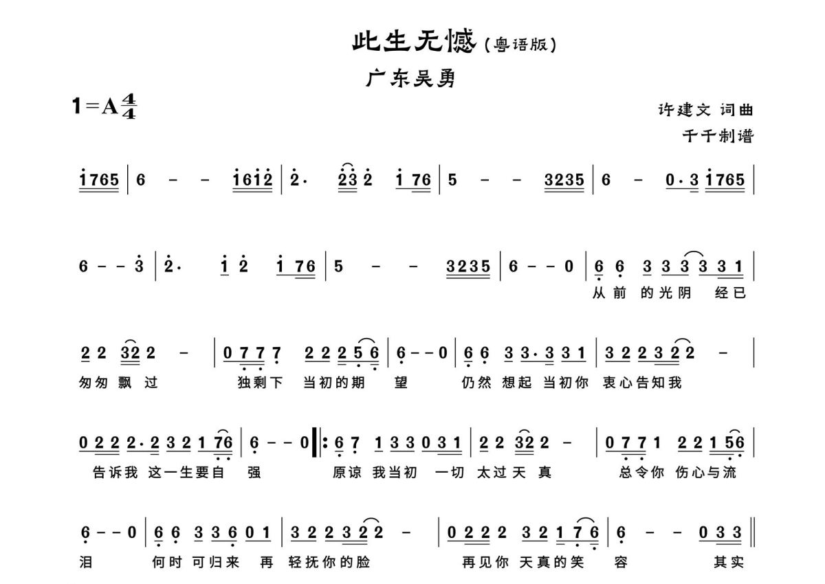 此生无憾简谱 - 广东吴勇演唱