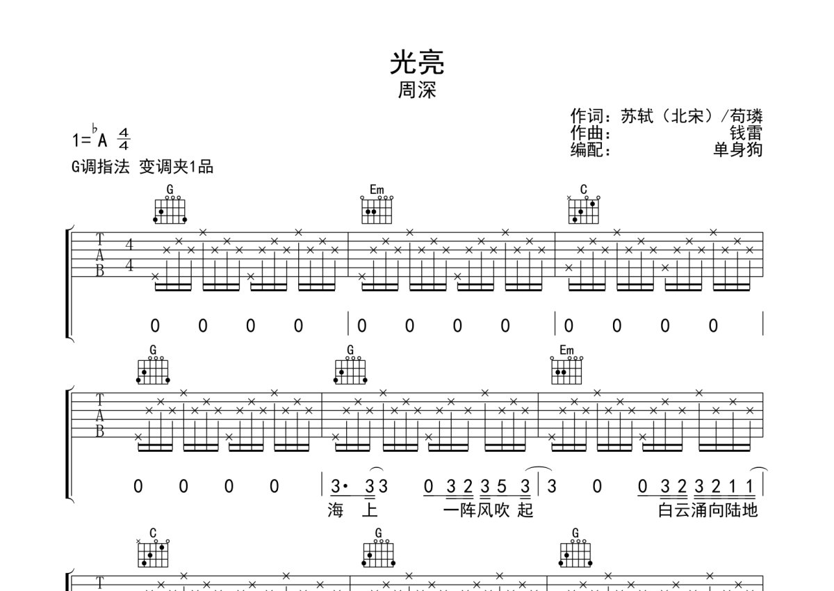 周深《光亮》吉他谱 - G调弹唱六线谱
