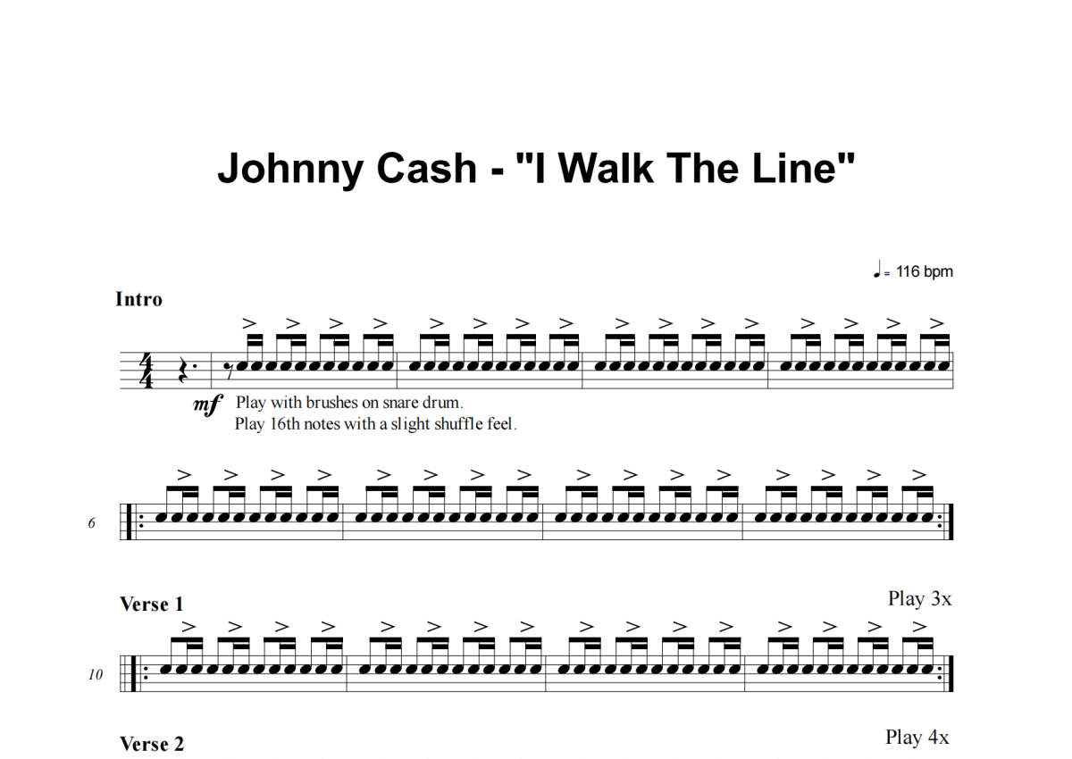 《I Walk The Line》是Johnny Cash演唱的一首歌曲,这份架子鼓谱共有两张高清图谱,图谱由 @举个例子 编配上传,图谱使用五线谱编配,使用这份I Walk The Line架子鼓谱,你将能够轻松地敲打出这首Johnny Cash的I Walk The Line,快来尝试吧。