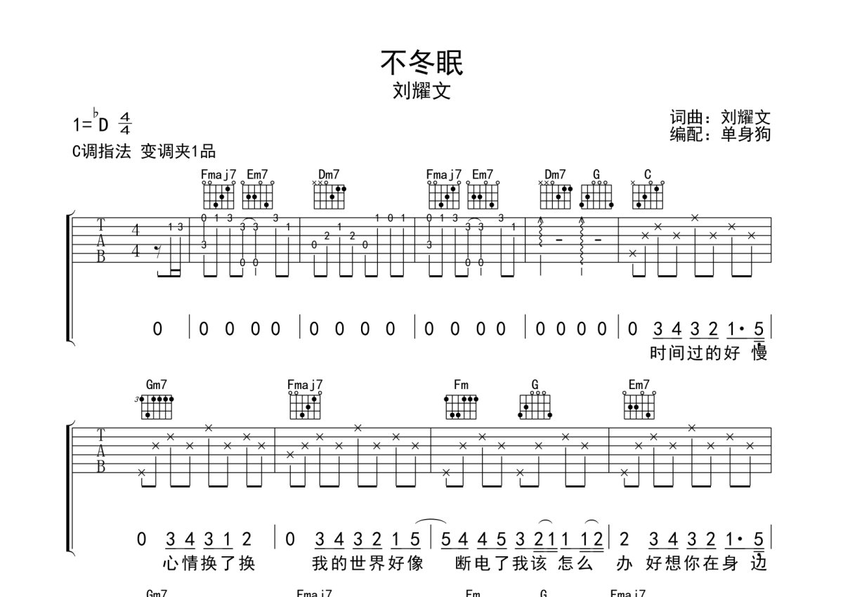 刘耀文《不冬眠》吉他谱 - C调弹唱六线谱
