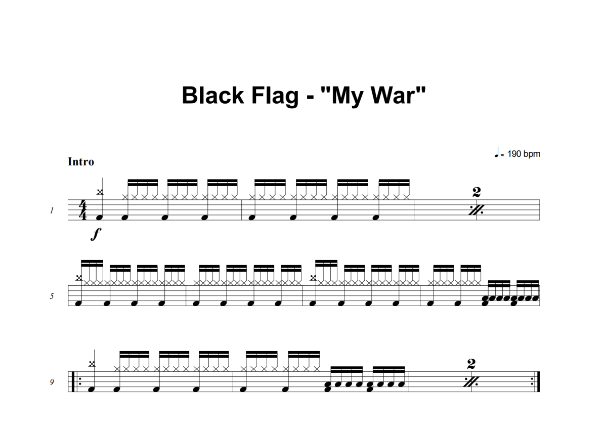 《My War》是Black Flah演唱的一首歌曲,这份架子鼓谱共有五张高清图谱,图谱由 @举个例子 编配上传,图谱使用五线谱编配,使用这份My War架子鼓谱,你将能够轻松地敲打出这首Black Flah的My War,快来尝试吧。