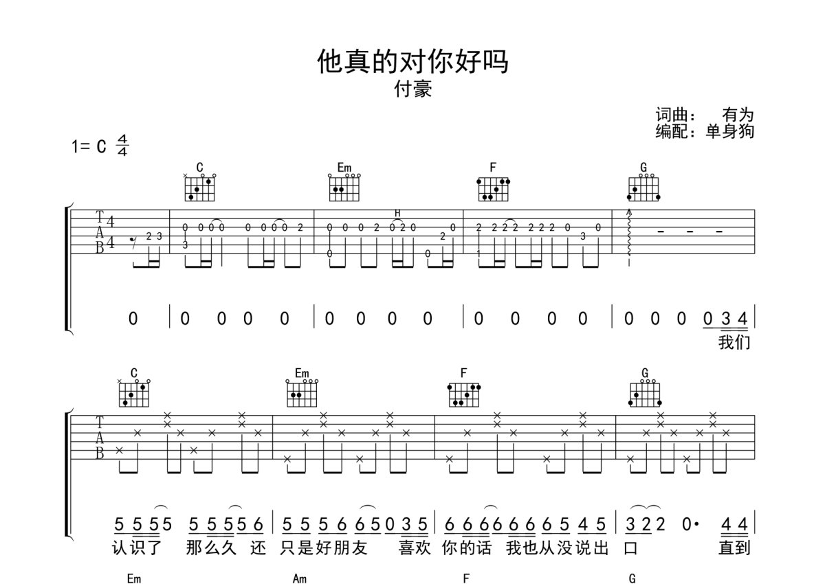 付豪《他真的对你好吗》吉他谱 - C调弹唱六线谱