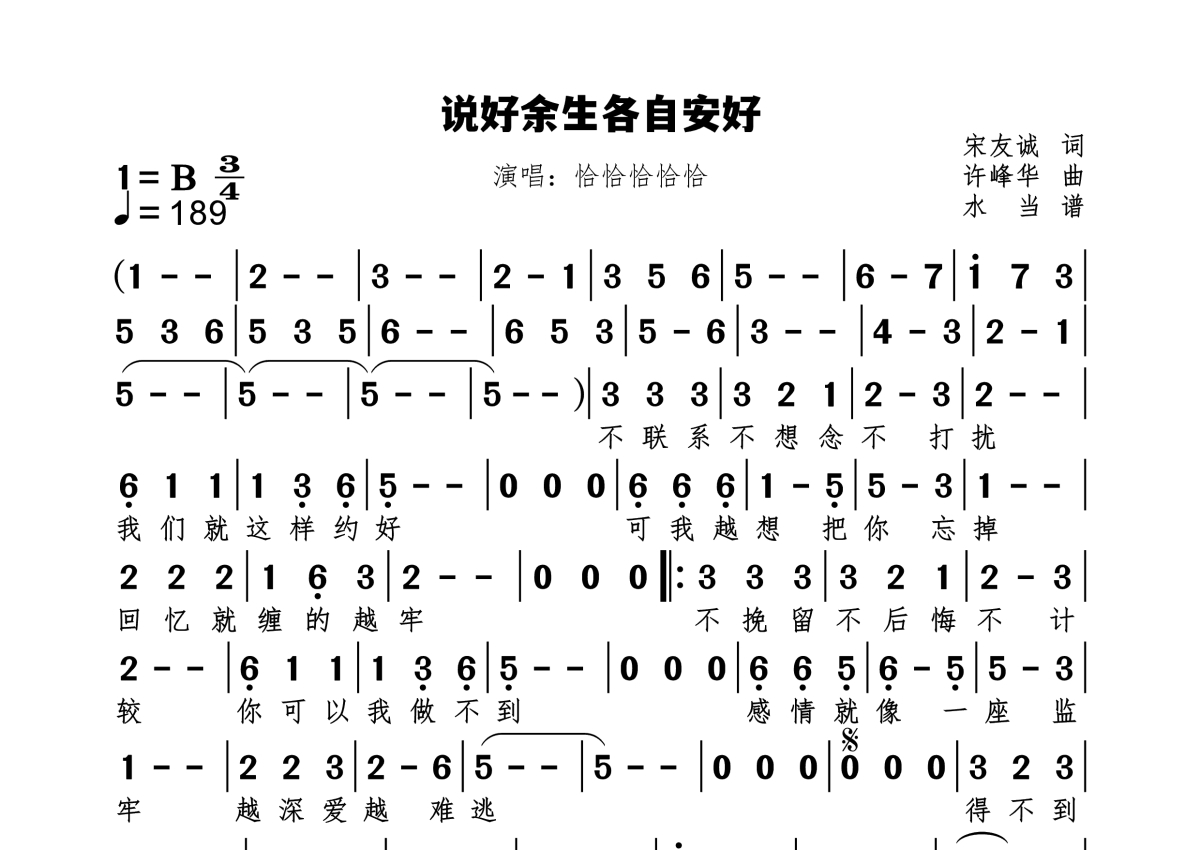 《说好余生各自安好》是恰恰恰恰恰演唱的一首歌曲,拍号为3/4拍,歌曲速度为每分钟189拍,这份简谱共有一张高清图谱,图谱由 @水当 编配上传原调B。
