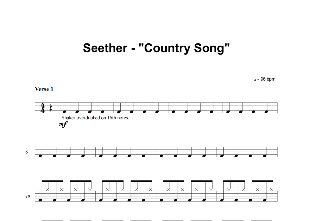 《Country Song》是Seether演唱的一首歌曲,这份架子鼓谱共有四张高清图谱,图谱由 @举个例子 编配上传,图谱使用五线谱编配,使用这份Country Song架子鼓谱,你将能够轻松地敲打出这首Seether的Country Song,快来尝试吧。