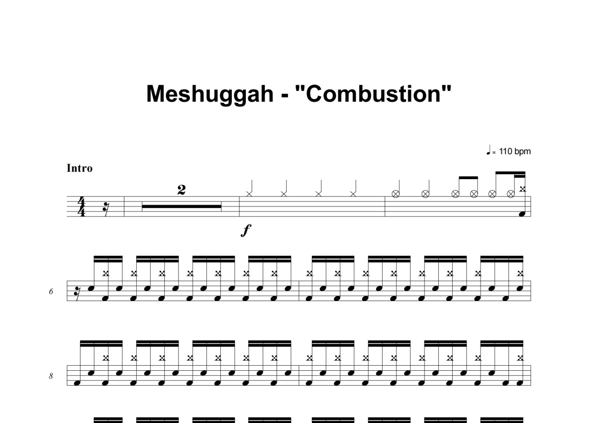 《Combustion》是Meshuggah演唱的一首歌曲,这份架子鼓谱共有七张高清图谱,图谱由 @举个例子 编配上传,图谱使用五线谱编配,使用这份Combustion架子鼓谱,你将能够轻松地敲打出这首Meshuggah的Combustion,快来尝试吧。