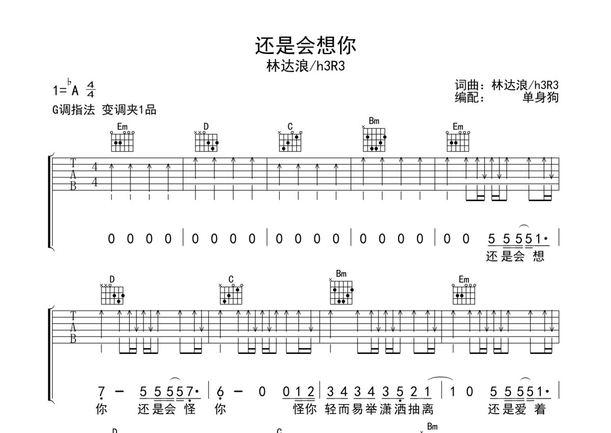 林达浪/h3R3《还是会想你》吉他谱 - G调弹唱六线谱