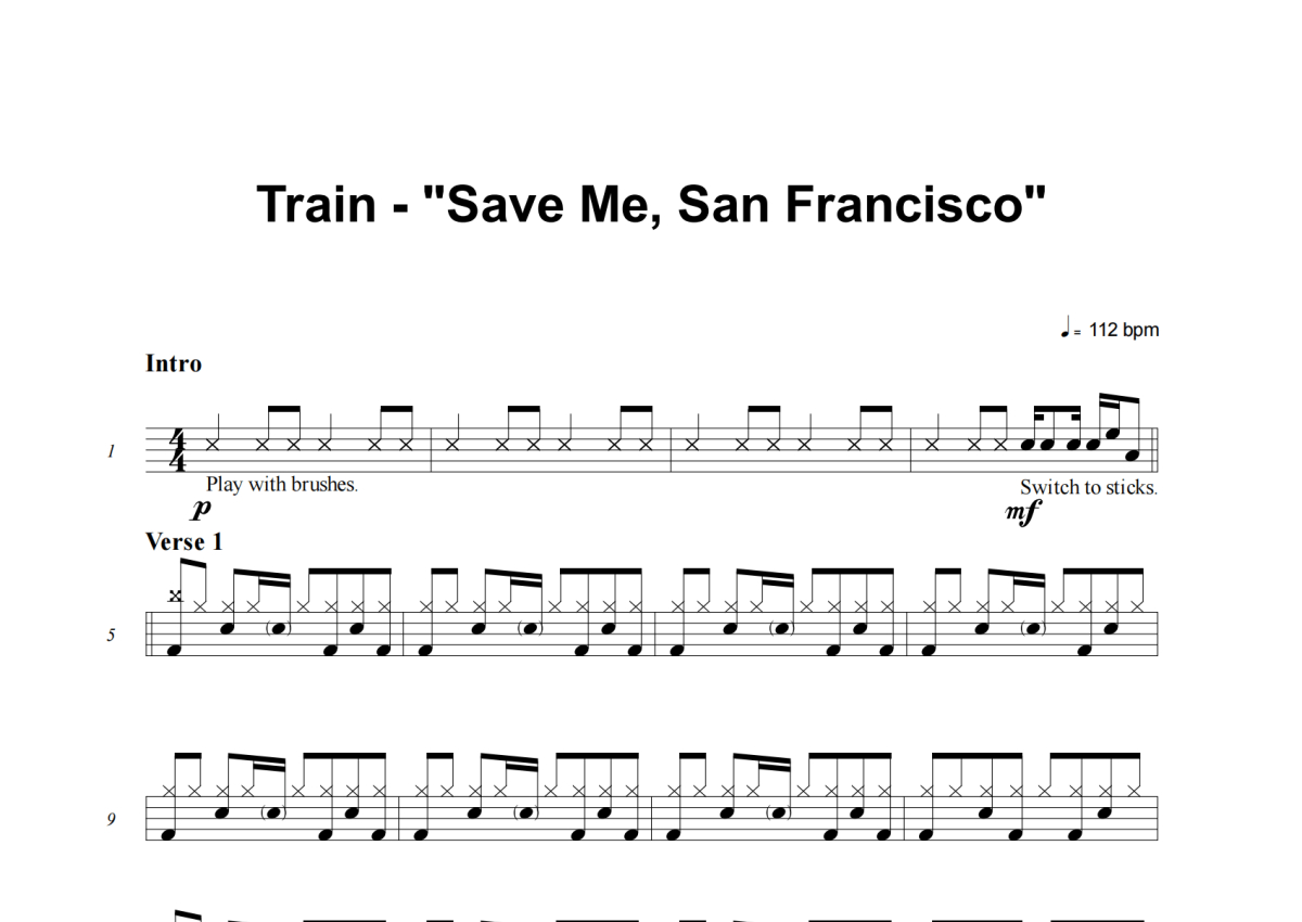 《Save Me, San Francisco》是Train演唱的一首歌曲,这份架子鼓谱共有四张高清图谱,图谱由 @举个例子 编配上传,图谱使用五线谱编配,使用这份Save Me, San Francisco架子鼓谱,你将能够轻松地敲打出这首Train的Save Me, San Francisco,快来尝试吧。