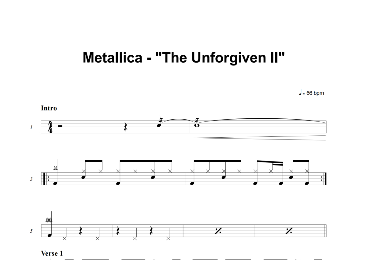《The Unforgiven II》是Metallica演唱的一首歌曲,这份架子鼓谱共有五张高清图谱,图谱由 @举个例子 编配上传,图谱使用五线谱编配,使用这份The Unforgiven II架子鼓谱,你将能够轻松地敲打出这首Metallica的The Unforgiven II,快来尝试吧。